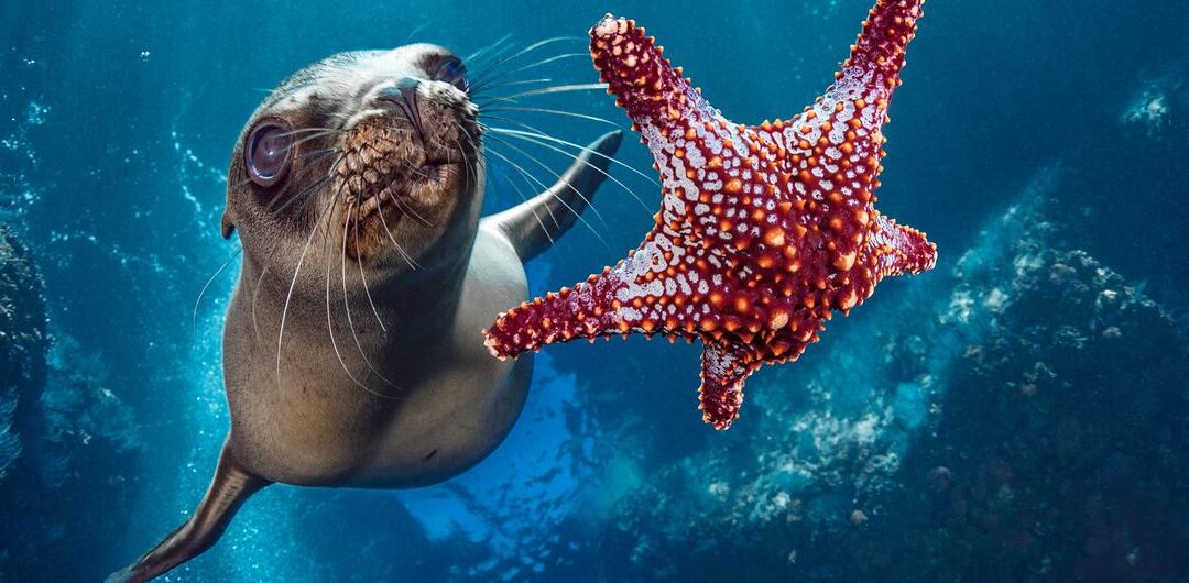 © Ocean Image Bank/Hannes Klost A sea lion swims past a starfish, highlighting the vibrant biodiversity of marine ecosystems.