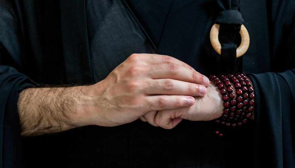 Next, place your hands in front of your chest in shashu. To make shashu, first form a fist with your left hand, wrapped around your thumb. Place that left hand against your sternum. Then, rest the right hand on top of the left—open, right thumb resting on the left thumb, fingers pointed to the left. Your forearms are parallel to the ground, elbows resting against your ribcage. (This placement of the hands is not unique to kinhin, by the way—it’s generally how one walks around in a Zen monastery.)